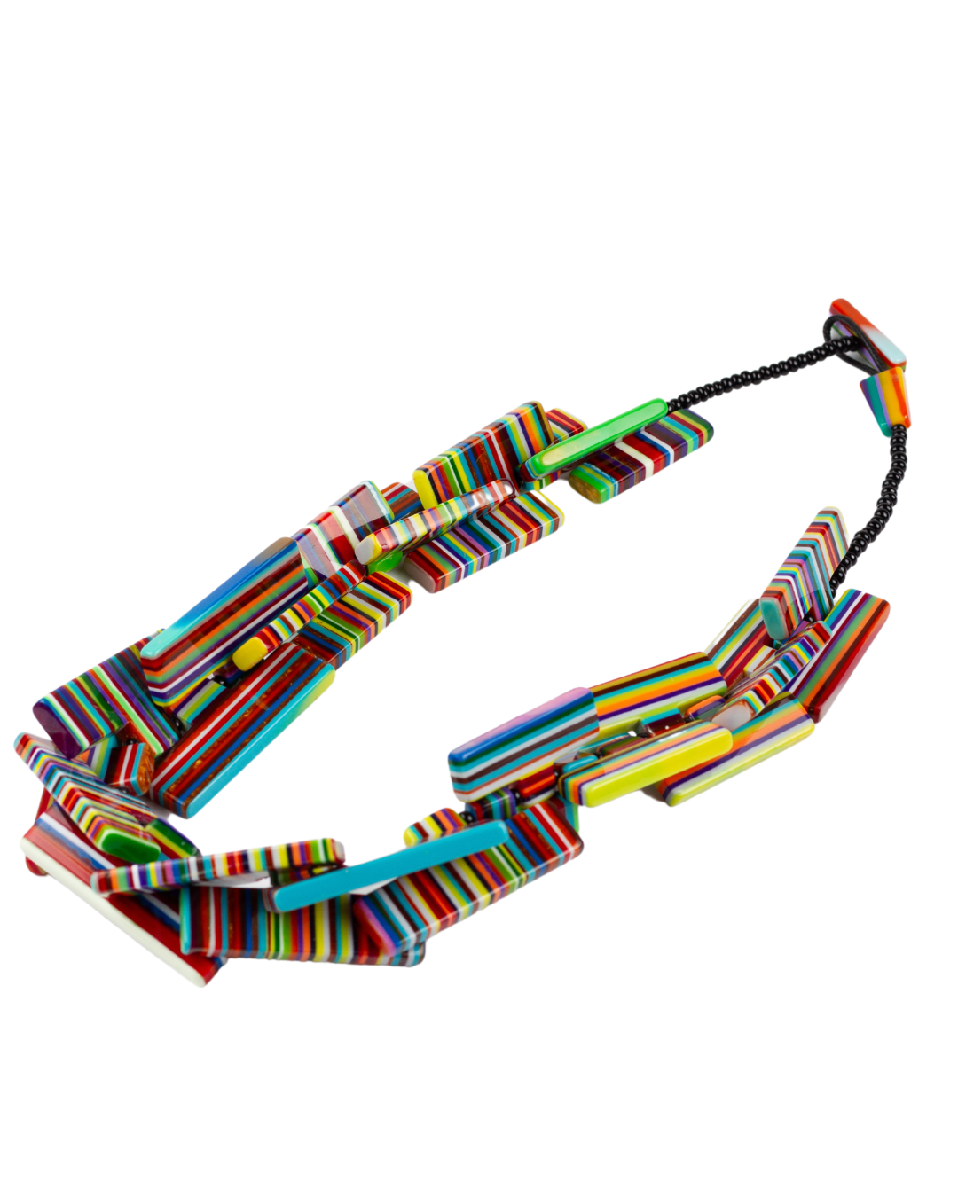 A bold statement necklace designed to stand out with its vibrant colors and modern silhouette.